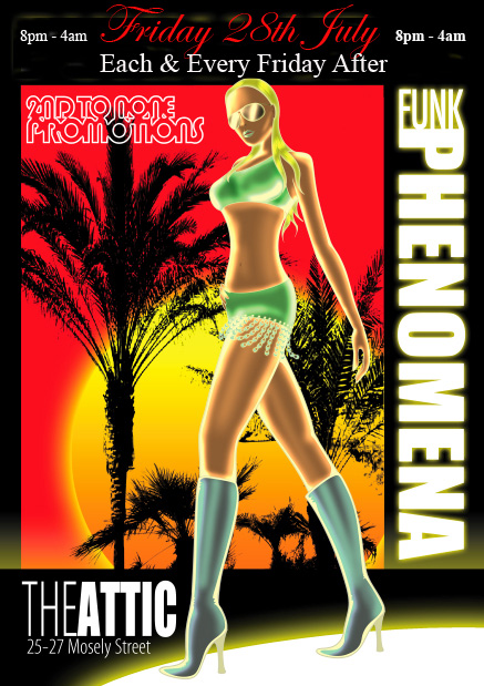 Funk Phenomena Music : Funky House, Jackin House, Electro House, Dirty House, Soulful House, Deep House, US House, US Garage, Progressive House and Tech House Forget everything you know about The Attic - 2nd 2 None Promotions are here with a colossus launch at the forefront of a new era Funk Phenomena launches on Friday 28th July and runs each and every Friday with PUKKA UP joining us on the last Friday of each month. These too massive funky house giants are set to transform the venue combining music of the highest quality with DJs hand picked from all over the UK as well as your favourite residents to ensure the vibe is right as always. Bringing a touch of class to Newcastle with 4 floors of seductive luxury and 2 entirely separate sound systems this is a truly colossus event where money has been no object in the creation or birth of this awe inspiring collaboration now add a lavish decor, Live percussion, some professional dancers, an array of Live acts and you have your setting. It really doesnt matter weather your sipping champagne in the VIP lounge or dancing your ass off, the experience and atmosphere will keep you coming back each and every Friday Believe the hype PUKKA UP & Funk Phenomena - IS HERE ! Floors 1 & 2 The first 2 floors explore the more soulful side of house with funky U.S beats offering a stylish and sexy sound. Champaign James, Beyond in Newcastle Matt D, Bodygroove, South Coasts finest Danny Knight, Rude in Oldham Scott Lee, Rude in Oldham Pete Collinson, Dusted inDerby Floors 3 & 4 The 3rd & 4th floor is the setting where we up the tempo with DJs seamlessly flowing from Funky House through to the tougher sound of pumping house then moving into Electro OPENAIR perform a full LIVE 2 hour set Including there club smash hit 'TheOctagon' as well as their current Galaxy most requested track for 3 consecutive months 'Hi Roller Featuring Gramma Funk' John Dixon, Love Dust in Sheffield Mister G, Funk Phenomena Nicky Larr, Loved Up in Leicester Alex Farrier, Beyond in Newcastle This amazing DJ line up will be complemented with our Stunning Professional Dancers and live percussion by Curly Floor 4 The 4th floor will offer an exclusive VIP area, which will feature A lavish seating area, Table waitress service, own private entrance into the club as well as fresh fruit and flowers for the ladies accompanied by a lavish cocktail menu. ALL EVENT DETAILS CAN BE HEARD ON GALAXY FM (NATION WIDE) SO LOOK OUT FOR THE COMPETITIONS Drinks Promotions through out the night This event will be recorded live for future CD release Doors open at 8pm till 2:30am, Bar closes at 3am, Club closes at 4am Dress code: Stylish, trendy, funky, no effort, no entry! Entrance Fee: 6 b4 11pm 8 after For VIP table bookings or guest list please call Lloyd on 07815997919